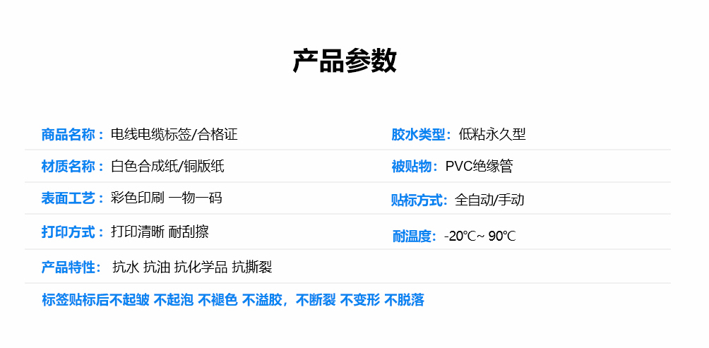 合格證標(biāo)簽與電線不殘膠,不掉標(biāo),不侵蝕電線上的PVC絕緣包皮。PVC電線上面的增塑劑太多,尤其是低煙無鹵的產(chǎn)品。